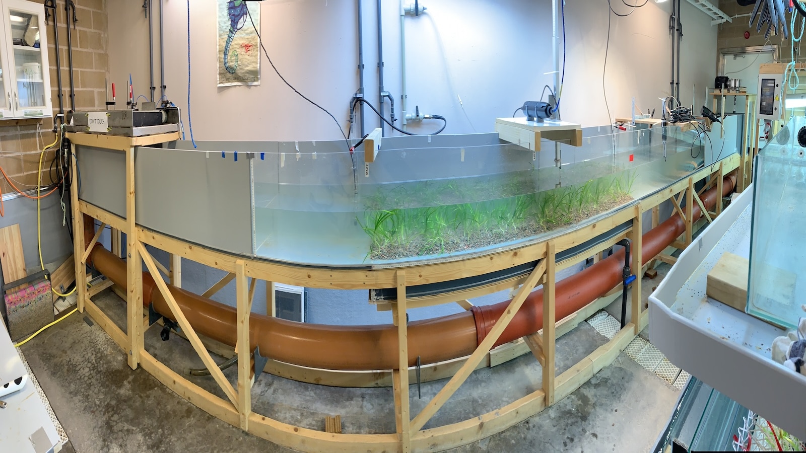The Seagrass Ecology Lab, located at Kristineberg marine station in Sweden, houses a hydraulic flume for studying the flow of water in a simple channel. The flume is capable of generating waves and currents to replicate conditions present in shallow coastal environments. It is a valuable tool for investigating the interactions between hydrodynamics and organisms, as well as sediment dynamics, wave propagation and turbulence.