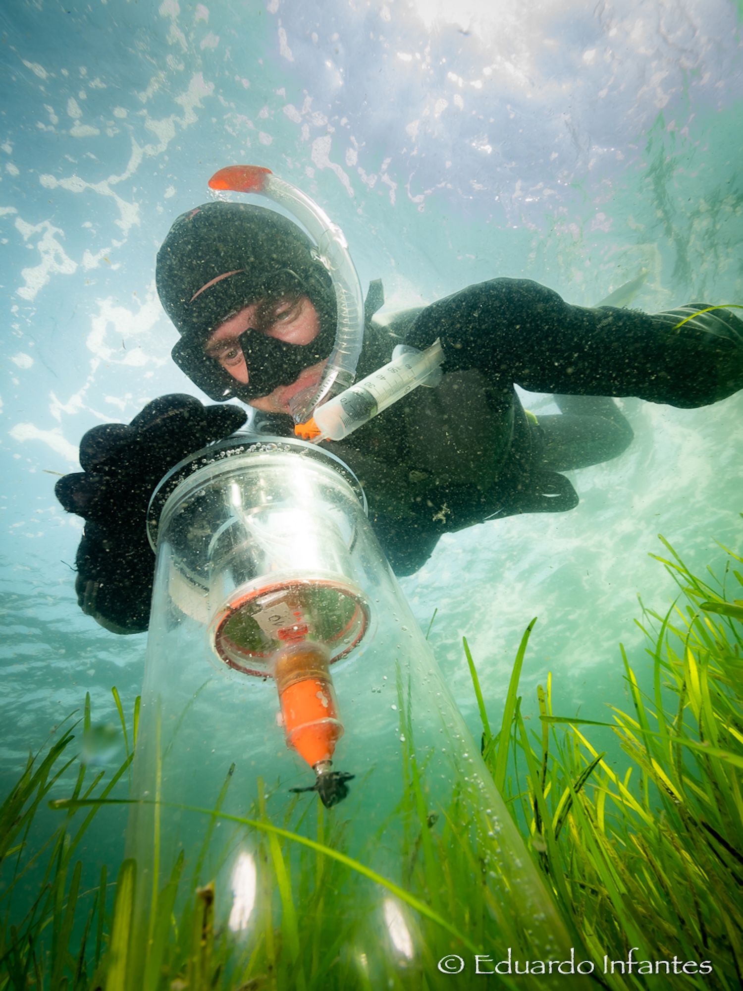 To address these questions, we investigated a chronosequence of bare sediments, adjacent Zostera marina meadows of three and seven years since restoration and a natural meadow located within a high-temperate marine embayment in Gåsö, Sweden. We combined continuous measurements of O2 fluxes using underwater eddy covariance with dissolved inorganic carbon (DIC) and O2 fluxes from benthic chambers during the productive season (July). Based on the ratio between O2 and DIC, we obtained site-specific photosynthetic and respiratory quotients from which we could convert eddy covariance fluxes to DIC. We assessed benthic diversity parameters as potential drivers of metabolic flux variability.